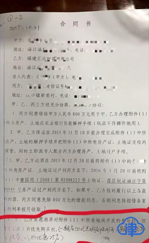 2015年9月底,就在过户期将至时,涵江农行的工作人员找到李玉火。“他们说我购买的房产早已被抵押给了银行,我们无权施工。”听到这个消息的李玉火才知道被李某坤欺骗。他从银行工作人员那里了解到,该房产在2012年就已在农行办理800万元的抵押,其中李某坤个人房产抵押了180万元、汇达公司房产抵押620万元,且贷款始终未还。